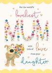Featuring The Word 'Mum' decorated with flowers Boofle with a bouquet of flowers.