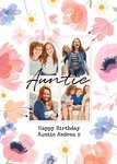 Front of card: Auntie's Photo Upload Birthday Card Four photo frames surrounded by colourful watercolour flowers. Text reads: "Auntie" and "happy birthday Auntie Andrea x". 'Happy birthday Auntie Andrea x' can be personalised!