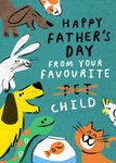 A fun and cheeky Father's Day card featuring a playful mix of illustrated pets, including a dog, cat, rabbit, bird, fish, snake, and more, surrounding a humorous message. The text playfully crosses out the word “pet” and replaces it with “child”, all set against a teal blue background. A perfect card for animal lovers with a sense of humour.