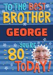 Front of card: 80 Today! Photo Upload Brother's Birthday Card Fun and vibrant typography with a flash photo frame surrounded by stars. Text reads: "To the best brother George you're 80 today!". 'George' can be personalised!