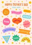"Happy Mother's Day, You are: the best, amazing, good, fun, loving, kind, smart, inspiring, caring, vibrant, cool, super."
