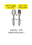 Front of card: Cartoon illustration of a stainless steel spoon and fork with speech bubbles and small heart between them. Text reads: "You're steel the one!" "Now and fork-ever!" Happy 11th Anniversary!