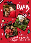 The postcard reads: "To daddy, lots of love + kisses, jamie, jak & jo"