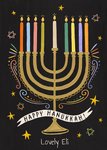 Front of card: A delightful and colourful Hanukkah card featuring hand-drawn menorah candelabra with multi-coloured lit candles and colourful, playful embellishment drawn squiggly and straight lines. There are stars of David and regular stars in the background.