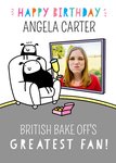 Front of Card: Fun illustrated characters with champagne glass sat in sofa watching TV photo frame Text reads: "HAPPY BIRTHDAY ANGELA CARTER. BRITISH BAKE OFF'S GREATEST FAN!" With editable name, TV show and photo upload option.
