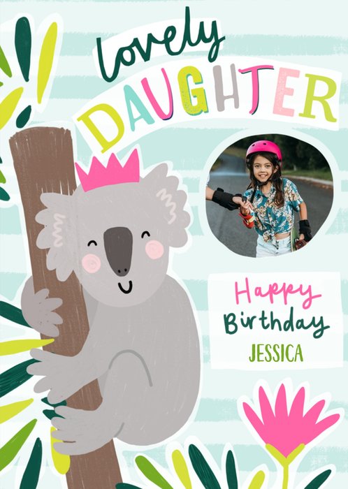 A cute and fun Birthday Card featuring a hand-painted illustration of a prehistoric scene with three dinosaurs; a Triceratops, a Brachiosaurus and a Tyrannosaurus rex. The T-rex is holding party balloons and the brachiosaurus is wearing a party hat. they are amongst trees, flowers, mountains and a volcano. There is a photo upload area inside a circle made of paintbrush strokes.