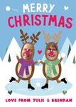 Fun Christmas card featuring an illustration of two Reindeers holding hands while ice skating, in a snowy mountain scene.
