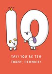 A fun and humorous Birthday Day card featuring an illustration of two cute dogs contorting themselves into the shape of a number 10, on a plain red background.