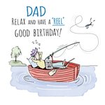 Features an illustration of a man in a row boat with a fishing rod having a snooze.