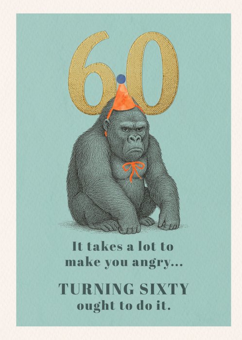 A teal background with a hand-drawn gorilla wearing an orange party hat and bow, large golden “60” text, and a humorous birthday caption.