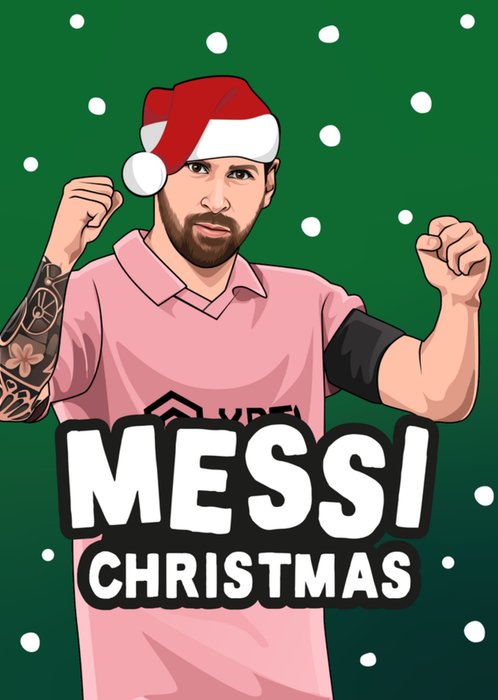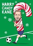 A humorous Christmas card featuring a illustrated hand-drawn caricature of a famous, well known footballer but his torso is a Christmas candy cane, he is running and kicking a football on a pitch, there are snowflakes in the background.