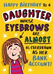 Text reads: "Happy Birthday to a Daughter whose eyebrows are almost as overdrawn as her bank account."