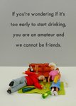 Front of card: Funny photograph of a male and female doll surrounded by bottles of alchohol getting very drunk Text reads: "If you're wondering if it's too early to start drinking you are an amateur and we cannot be friends"> Back of card: Bold and Bright logo. Moonpig logo