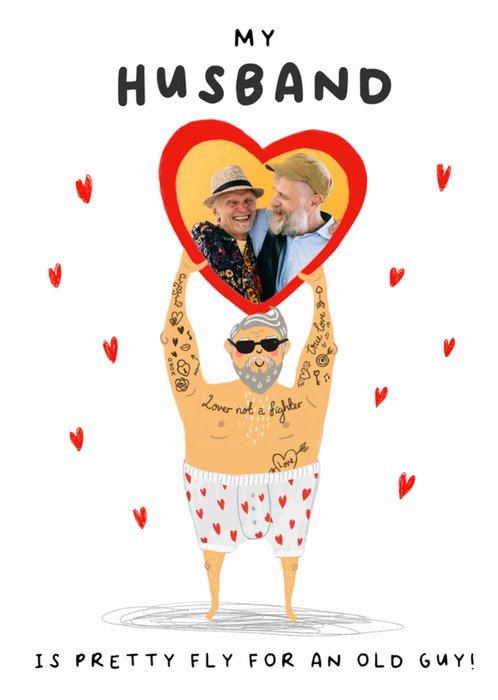 Front of card: Features an illustration of an older man with tattoos, wearing heart print boxer shorts holidng up a big red heart which is a photo upload..
