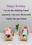 A humorous birthday card featuring a playful doll scene of two friends relaxing at a spa, symbolising the transition from clubbing nights to brunch and self-care days. Perfect for a friend who embraces a more relaxed lifestyle with humour.