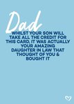 Front of card: Funny Typographic Dad Your Son Will Take All The Credit For This Card Text reads:"Dad Whilst Your Son Will Take All The Credit For This Card, It Was Actually Your Amazing Daughter In Law That Thought Of You And Bought It"