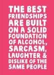 Text reads: "The Best Friendships Are Built On A Solid Foundation Of Alcoholism, Sarcasm, Laughter And Dislike Of The Same People"