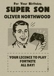 "For Your Birthday SUPER SON OLIVER NORTHWOOD. YOUR LICENCE TO PLAY FORTNITE ALL DAY!"