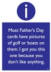 Front of card: The card is laid out like a spoof safety sign, featuring text in a blue box. Text reads: "Most Father's Day cards have pictures of golf or boats on them. I got you this one as you don't like anything."