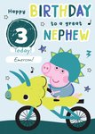 Front of card: Peppa Pig Nephew's Birthday Card Illustration of George Pig riding a dinosaur bike. Text reads: "Happy birthday to a great nephew 3 today! Emerson!". '3' and 'Emerson' can be personalised!