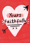 This Valentine’s Day card design features a red background with a large hand-painted pink heart at the centre, accented by black arrows and text elements. The card displays the message “Yours Faithfully” prominently in the middle of the heart, with additional decorative elements like underlines and two “x” marks below the text.
