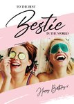 Gift Delivery typographic photo upload card. The non editable caption reads To The Best Bestie In The World. Happy Birthday. The card background colour is white with a pink diagonal brush strip framing the photo.