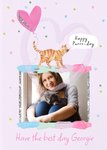 Featuring an illustration of a ginger cat, with a pink heart shaped balloon tied to it's tail, surrounded by confetti on a light pink background. Underneath is a photo upload in a watercolour and glitter style frame.