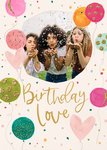 Featuring a central round photo upload area, surrounded by illustrations of round and heart shaped balloons with glitter effect patterns, and confetti, on a light pink background.