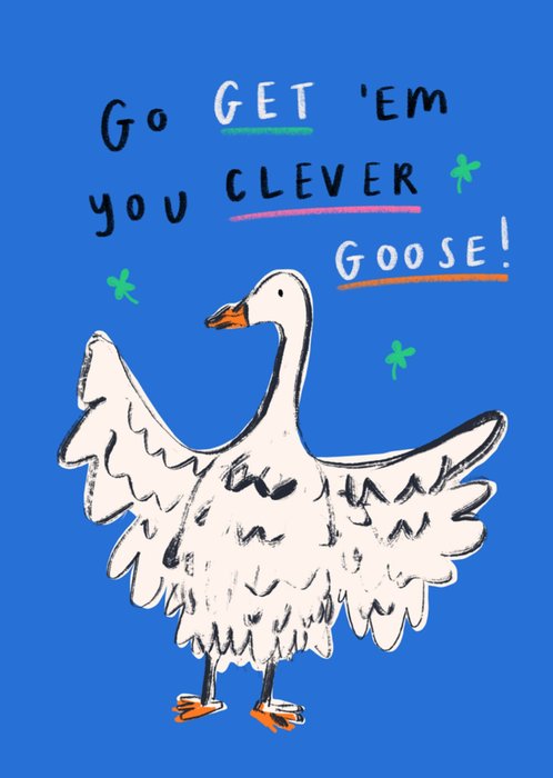 Featuring a hand-drawn white goose with wings spread, playful handwritten lettering, and colourful underline details on a blue background.