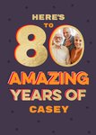 Front of card: A fun and bold Birthday card featuring big bold text in the centre of the card with one photo upload area in the zero of the number 80. There are also hand-drawn dots in the background.