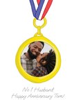 Front of card: Gold Medal Photo Upload Anniversary Card Illustration of a gold medal with a photo frame. Text reads: "No 1 husband happy Anniversary Tom!". All text can be personalised!