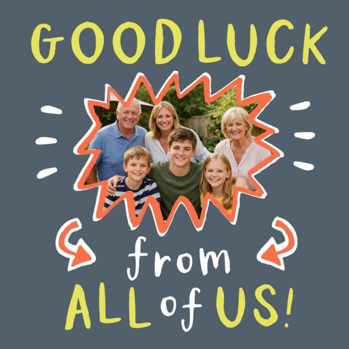 A fun, modern design featuring a central star shaped photo frame surrounded by a hand-lettered good luck message with arrows and accent lines on a grey background.