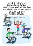Front of card: Illustration of men on spinning machines and one man spinning plates Text reads: "Malcom didn't know what the fuss was about, spin classes were a doddle!" With editable name