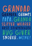 "Grandad, grandpa. Gramps. Papa. Granda. Slipper wearer. Best storyteller. Hug giver. Snorer. Mine!"