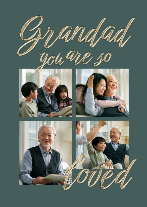Featuring four central photo frames surrounded by gold foil effect text on a muted green/blue background.