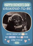 Front of card: Grandad-to-be Father's Day Photo Upload Card Circular photo frame with a sentimental message. Text reads: "Happy Father's Day grandad-to-be I know I haven't met you yet, but something tells me you're going to be my hero!".