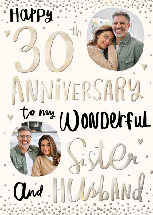 Front of card: Featuring 1 circular photo area surrounded by hand-lettered black script and shimmering silver typography, all on a white background scattered with heart & polka dot illustrations.br> Text reads: "Happy 30th anniversary to a wonderful granddaughter & partner."