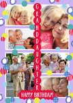 Featuring a collage of six photo frames surrounded by colourful circle patterns on a purple background.