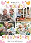 Featuring four photo upload frames set in a grid layout, decorated with playful pink and yellow hearts. The card has cheerful, bold typography in pink and orange celebrating a wedding anniversary for a grandma and grandad. A bright, personalised design, ideal for showcasing treasured memories and marking a joyful milestone for a much-loved couple.