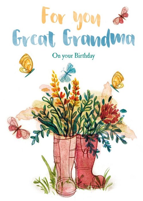 Flowers in Wellington boots traditional illustration - Happy birthday Great Grandma