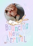 A pastel-toned new baby card featuring a bunny lying across the text, with a photo upload frame above. Surrounded by butterflies, a ladybird, dragonflies, birds and flowers with stitched-line doodles on a soft lilac and aqua gradient background.