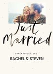 Front of card: Just Married Photo Upload Card Handwritten typography on a white background. Text reads: "Just married congratulations Rachel & Steven". 'Rachel & Steven' can be personalised!