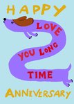 A playful and humorous anniversary card featuring a long purple sausage dog with the pun "Love You Long Time." A cute and quirky way to celebrate a special milestone with your partner.