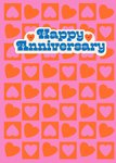 A greeting card featuring chunky blue “Happy Anniversary” letters in a bubbly white banner above a checkerboard of orange heart squares, all bursting against a bright pink background.