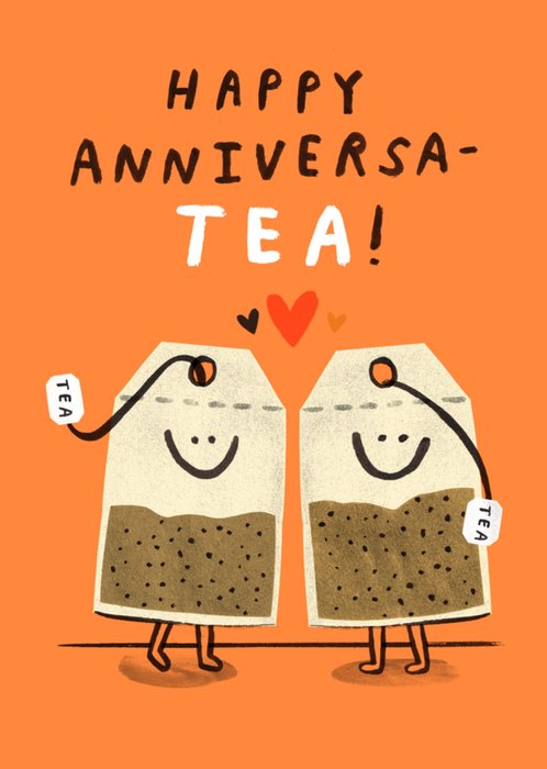 A humorous design featuring two smiling tea bag characters with small hearts above, on an orange background.