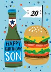 Happy Birthday 20th Son Illustrated Beer Bottle and Burger Birthday Card