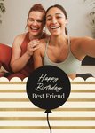 Featuring one photo area above a black balloon illustration with an editable birthday message on a scalloped, gold and cream striped background.