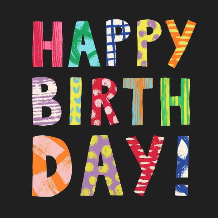 Featuring large colourful block letters filled with diverse patterns spelling out a bold message on a black background, this greeting card has a lively and eye-catching birthday design.