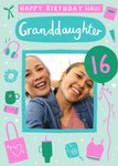 This birthday card for a granddaughter features a pastel green background with playful illustrations, such as headphones, a chocolate bar, and a water bottle, scattered around the design. The text “Happy Birthday Haul Granddaughter” is displayed in a mix of pink and white fonts at the top, while a circular green balloon on the right showcases the age “16” in pink. A rectangular photo upload area is centred in the bottom half of the card, bordered in teal for a vibrant highlight.