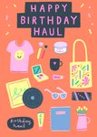 This greeting card design features a vibrant orange background with the text “Happy Birthday Haul” prominently displayed in pink on a black block. The design is filled with whimsical, pastel-coloured illustrations of birthday-related items such as a pink t-shirt with a smiley face, a tote bag, makeup brushes, body butter, sunglasses, chocolate, and a vinyl record. There is no dedicated photo upload area on this card, focusing solely on the illustrated elements and celebratory text.